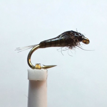 Cette nymphe imite un peu toutes les petites larves d'éphémères foncées que l'on retrouve dans nos rivières. Son corps vernis lui confère une descente assez rapide, et le dubbing du thorax un aspect des plus réaliste.